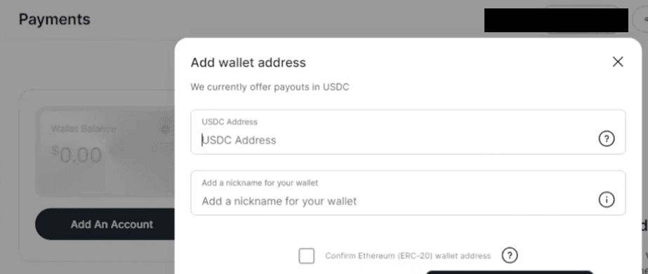 Example 2: a different platform forces payouts in USDC on a single blockchain and requires users to manually paste a wallet address to complete the payout setup.
